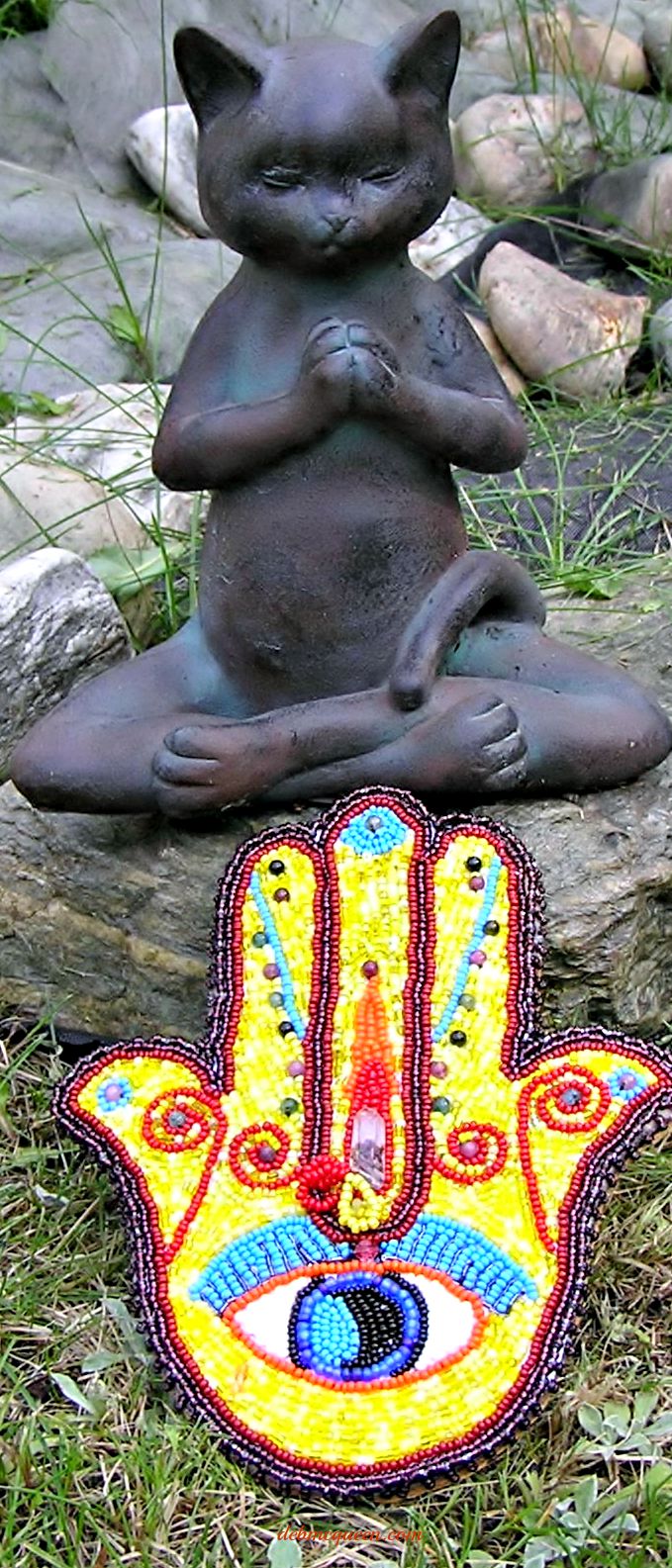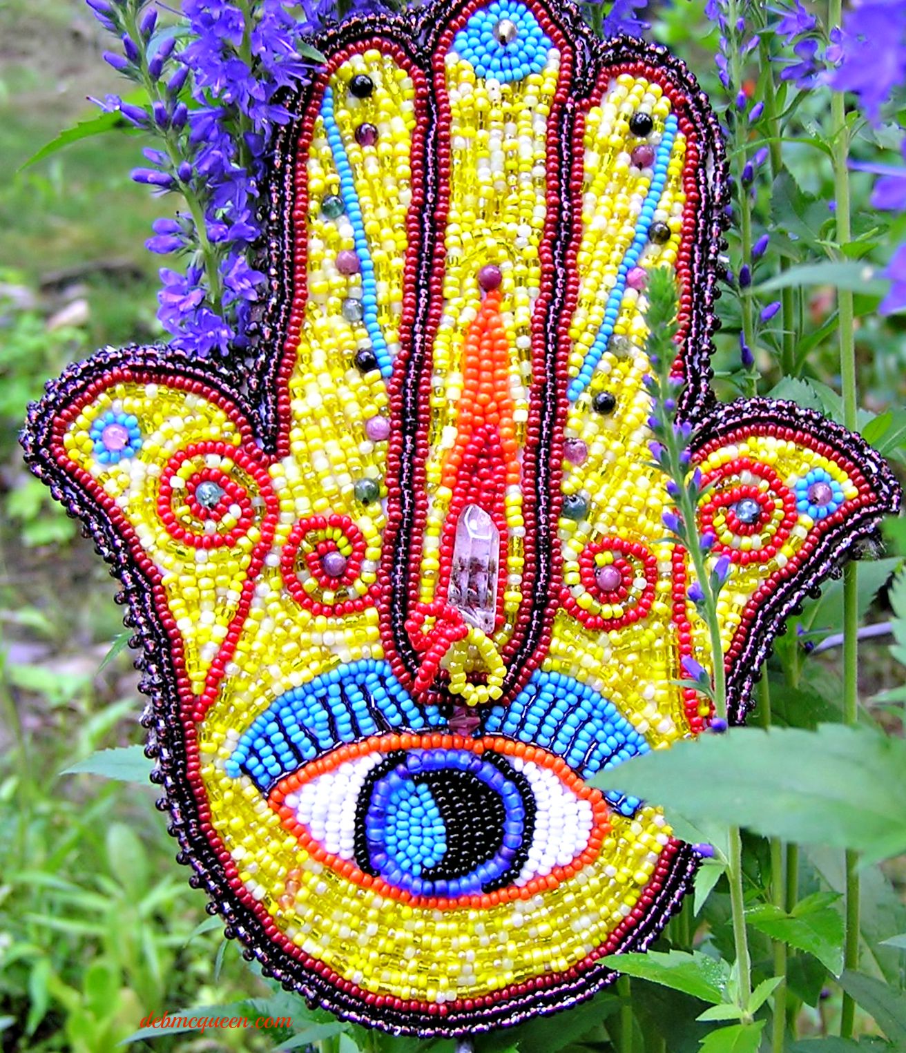 This is a Hamsa , Hamesh or Hand of Fatima. It is an apotropic amulet of protection . It is believed to protect one from the envious and/or the evil eye. The word Hamsa means 5, refers to the digits of the hand. I thought it was a very nice amulet that needed to be beaded. I had fun doing this one, working with the bright colors cheered me up on the rainy days. Yes, we had 3 days of rain in North Pole. Great to have some rain, plus I had beading time. Hope you enjoy this one.