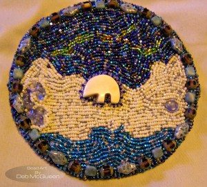 This is the second piece using the polar bear/northern lights theme. It is 5 inches in diameter. I had fun making it scenic, a new thing for me.